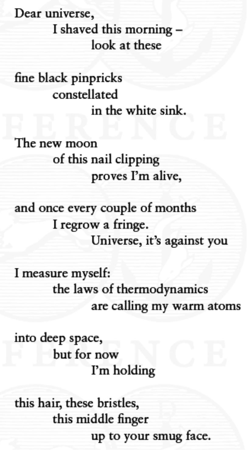 Many of the poems are epistolary: “Dear Universe,” “Dear Nostalgia” (“faithful toady/and arse-kissing best friend”), “Dear Hey Land Cemetery”, “Dear Planet”, “Dear would-be readers”, often with a specific ask, such as paying attention to words, or a direction to move forward, as in “Dear Kirklees Council, I say//plough all you like.” My favourite of these letter poems contains a defiant address to the Universe that gives the middle finger to entropy and death through the simple act of daily grooming: